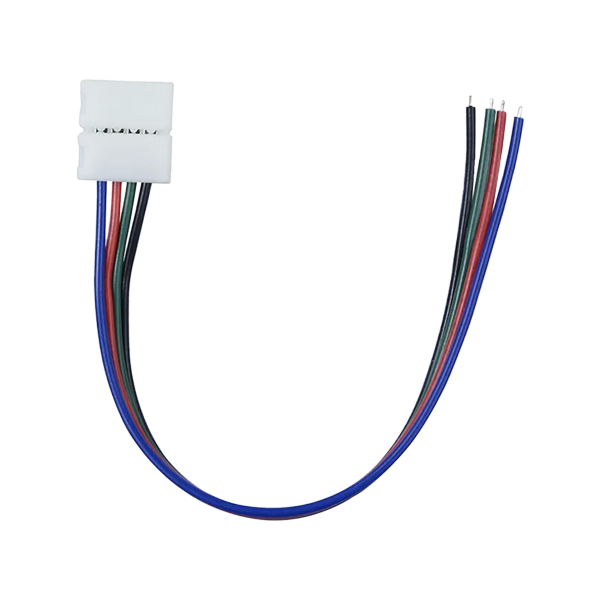 One-sided LED connector with a cable for 10 mm wide LED strips with max. 48V. This is a convenient solution for quickly connecting an RGB (color) LED strip to a power supply unit, controller or other wiring.