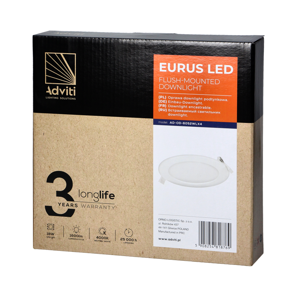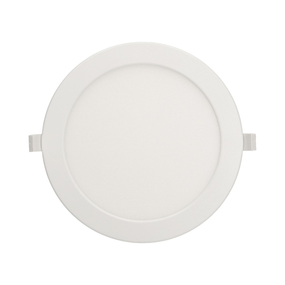 Round ceiling downlight with a built-in power supply, designed for flush mounting in plasterboard structures, e.g. in suspended ceilings. This downlight uses SMD LEDs, which guarantee high energy efficiency and have a long service life. This luminaire works with rated power of 18 W and emits light with luminous flux of 1600 lm, with a neutral white color, which is 4000K. Material: PMMA + aluminum insert.