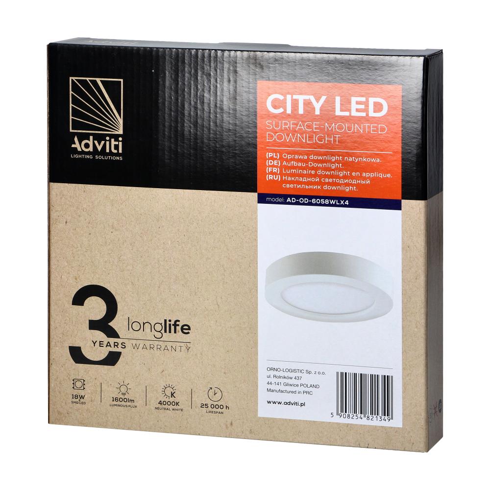 Round LED downlight luminaire with a built-in power supply, designed for surface mounting in rooms such as kitchens, or in areas like staircases, corridors, basements, garages, etc. Modern SMD LED diodes used in the product guarantee high energy efficiency and long life of the device. The presented wall and ceiling lamp works with rated power of 18W and emits light with luminous flux of 1600 lm. It shines at a temperature of 4000K. This color of light is basically intended for homes because it is pleasant for reading and working, but it does not give the impression of sharp office light. The product is suitable for both ceiling and wall mounting, and the composition of several such luminaires will create an interesting visual effect, e.g. in the hall or staircase. Material: PMMA + aluminum.