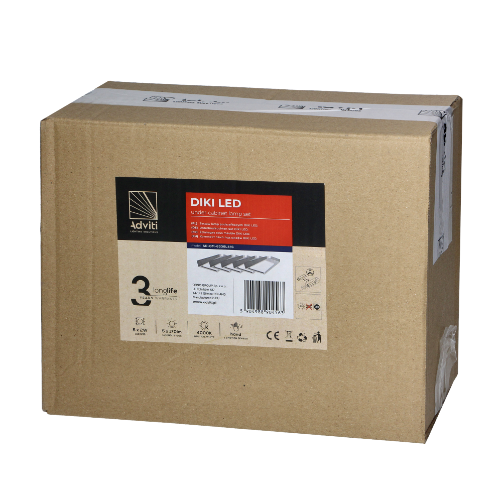 DIKI set of 5 under-cabinet LED lamps, 5x2W, 4000K, with touchless switch, silver colour