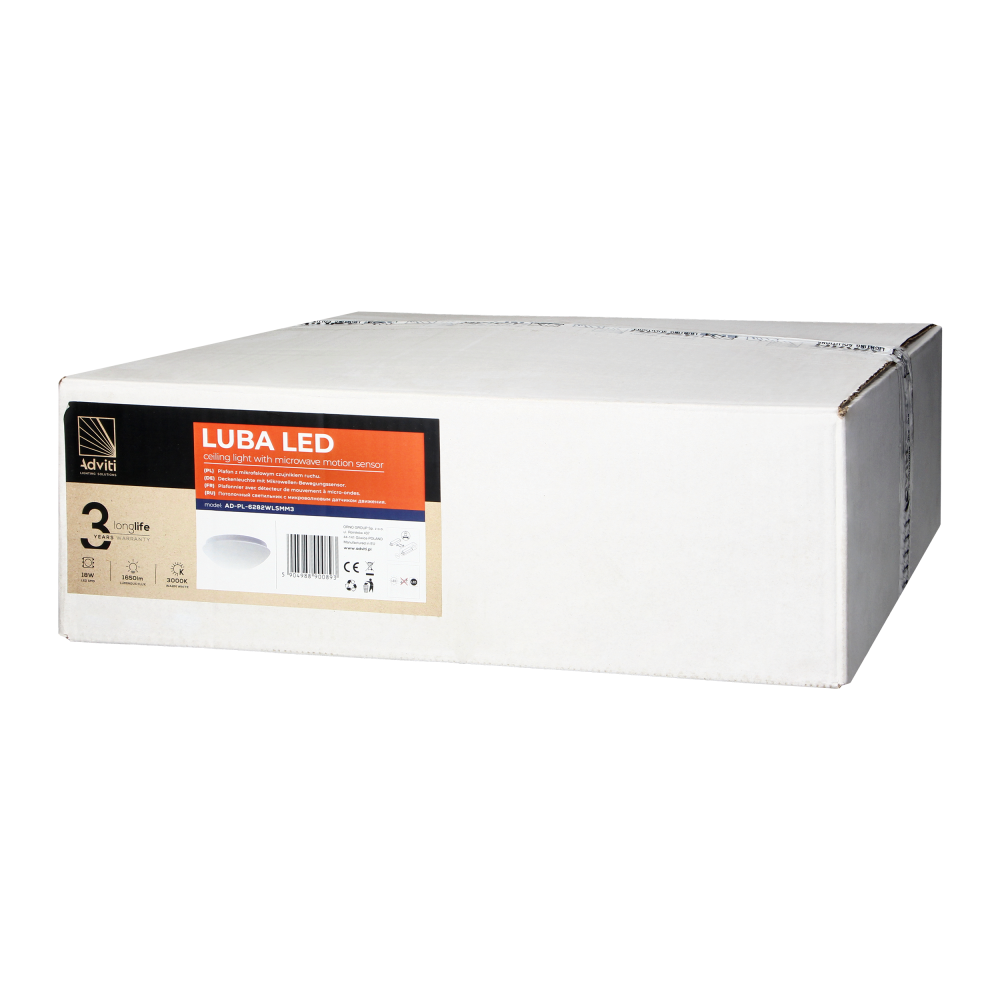 LUBA LED luminaire with microwave motion sensor, 18W, 3000K, 1650lm, white-steel, matt glass diffuser, IP44