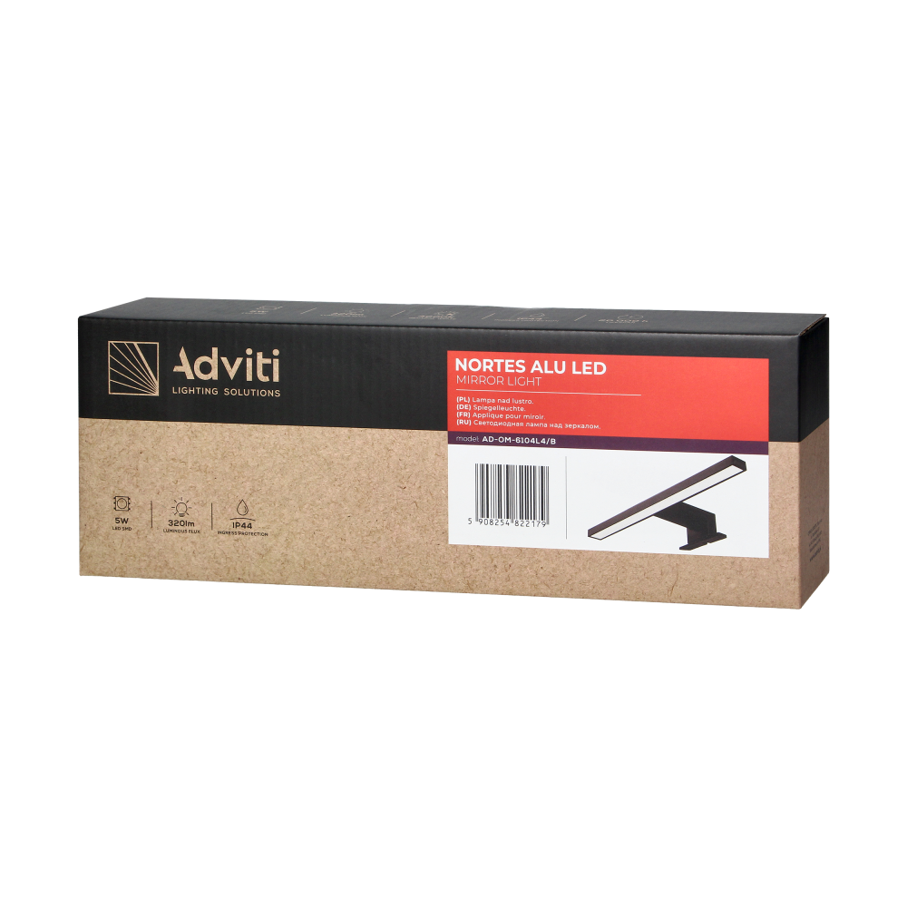NORTES LED lamp for illuminating mirrors, showcases, paintings or other elements that we would like to display with light. The lampshade, made of plastic, has a long, flat shape, thanks to which it ensures even illumination of a given surface. The simple and elegant form of this luminaire will make the lamp look good both in a modern bathroom and in interiors full of classic furniture, in which there are items worth special distinction with light. The light source in this product has a form of SMD LEDs that emit light with a natural white color. Despite low energy consumption of 5W, the luminous flux of the emitted light is high and equals to 320lm. The IP44 ingress protection class guarantees sufficient protection against dust and water splashing from any angle. Thanks to this the lamp is a safe solution for installation in the bathroom and other rooms with increased humidity. This type of lighting has been designed in a way that allows installation on the cabinet or mirror frame. The product is made of aluminum in black color. The length of the luminaire is 30 cm.
