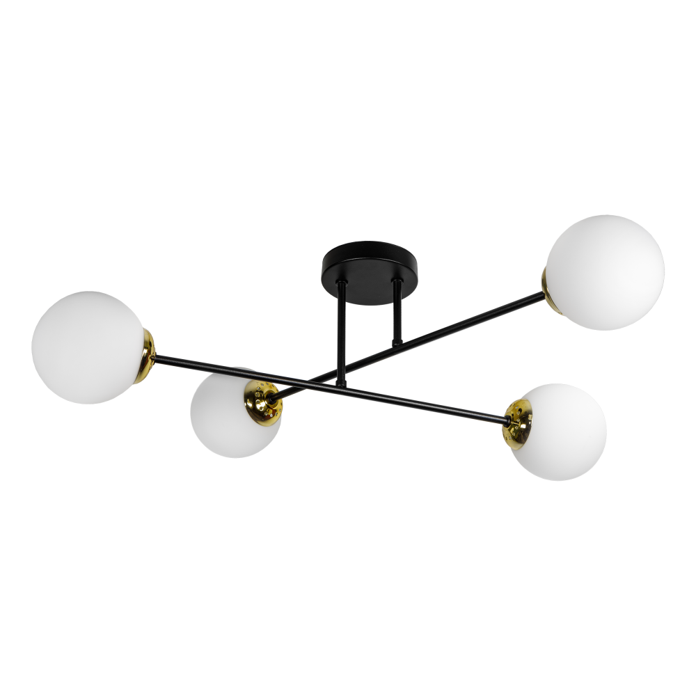 The LEIA 4P model, is a pendant light consisting of 4 individual light sources set in pairs on crossed arms in black and gold. It is suitable for interchangeable E27-type light sources, each with a maximum wattage of 60W. It is designed to be mounted on the ceiling, allowing you to create an original arrangement that will decorate your interior with more than just light.