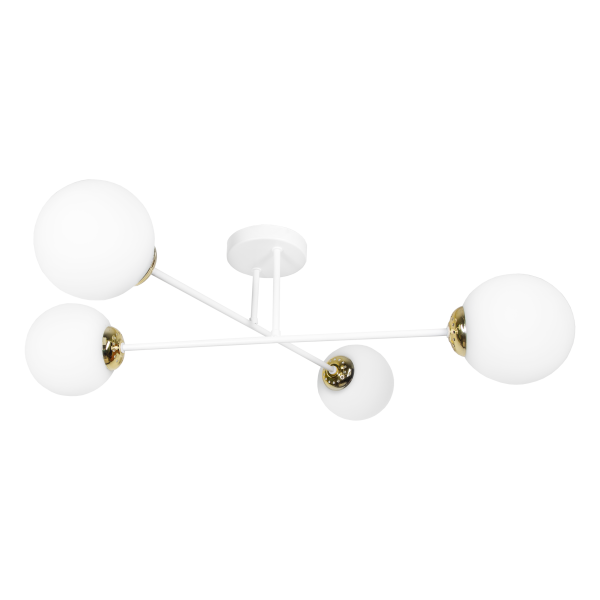 The LEIA 4P model, is a pendant light consisting of 4 individual light sources set in pairs on crossed arms in white and gold. It is suitable for interchangeable E27-type light sources, each with a maximum wattage of 60W. It is designed to be mounted on the ceiling, allowing you to create an original arrangement that will decorate your interior with more than just light.