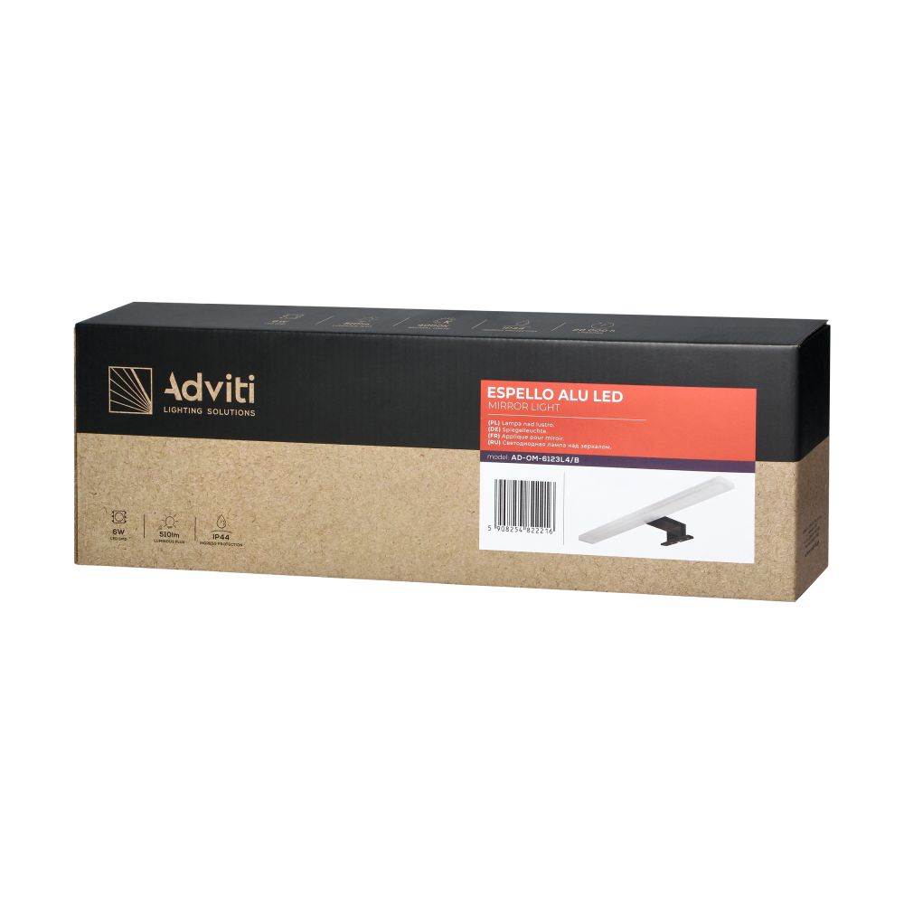 Lampa ESPELLO LED do oświetlenia luster, gablot, obrazów czy innych elementów, które chcielibyśmy wyeksponować za pomocą światła. Akrylowy klosz lampy ma wydłużony, płaski kształt, dzięki czemu zapewnia równomierne oświetlenie danej powierzchni. Prosta i elegancka forma tej oprawy sprawi, że lampka dobrze będzie prezentować się zarówno w nowoczesnej łazience jak i we wnętrzach pełnych klasycznych mebli, w których są przedmioty warte szczególnego wyróżnienia przy pomocy światła. Źródłem światła są w tym produkcie diody LED SMD, które emitują światło o naturalnej białej barwie (4000K). Pomimo niskiego zużycia energii 6W, moc emitowanego światła jest duża, bo wynosi 510lm. Stopień ochrony IP44 gwarantuje wystarczającą ochronę przed drobinkami kurzu i wodą chlapiącą pod każdym kątem. Oznacza to, że lampa z takim stopniem szczelności jest bezpiecznym rozwiązaniem do montażu w łazience i innych pomieszczeniach o podwyższonej wilgotności. Ten rodzaj oświetlenia został zaprojektowany w sposób, który umożliwia 4 metody montażu – w gablocie, nad lustrem i na ścianie na 2 różne sposoby. Produkt wykonany jest z aluminium w kolorze czarnym. Długość oprawy wynosi 40 cm.
