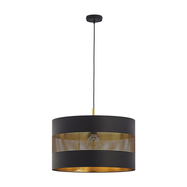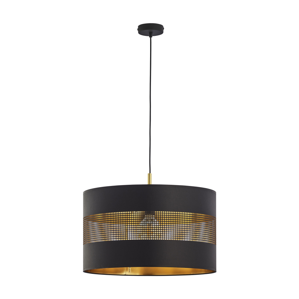 Lampa ALESSIO jest wykonana w nowoczesnym stylu. Czarne abażury wykonane z holenderskiej tkaniny, które od środka zostały powleczone złotą folią pięknie oddają światło, a dodatkowym atutem, są wycinane laserowo drobniutkie otwory w kształcie kwadratu, które przepuszczając światło tworzą na ścianach delikatne wzorki. Dostępna jest także wersja z czterema źródłami światła.