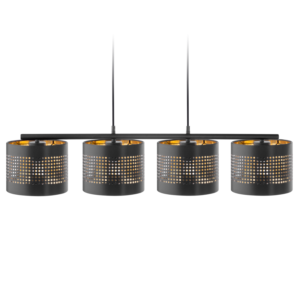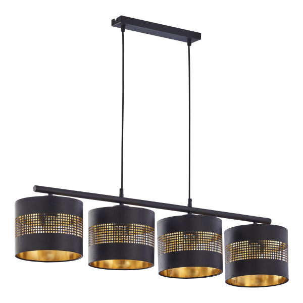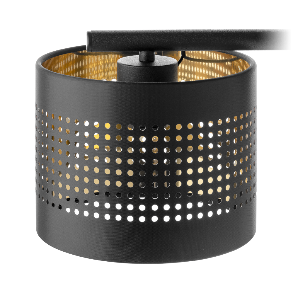 Lampa ALESSIO jest wykonana w nowoczesnym stylu. Czarne abażury wykonane z holenderskiej tkaniny, które od środka zostały powleczone złotą folią pięknie oddają światło, a dodatkowym atutem, są wycinane laserowo drobniutkie otwory w kształcie kwadratu, które przepuszczając światło tworzą na ścianach delikatne wzorki. Dostępna jest także wersja z jednym źródłem światła.