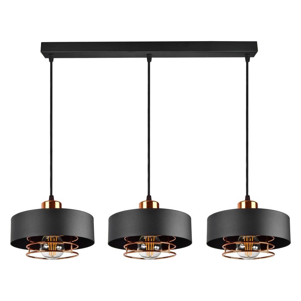 CHIRO to lampa wisząca przystosowana na 3 żarówki z gwintem E27 o maksymalnej mocy świecenia 60W każda (brak w zestawie). Zastosowanie wymiennego źródła światła pozwala każdemu użytkownikowi na indywidualny dobór rodzaju żarówki i na dostosowanie jej kształtu oraz barwy światła do własnych preferencji. Lampa utrzymana jest w stylu loftowym i doskonale wkomponuje się w pomieszczenia surowe i minimalistyczne, w których dominują cegła, beton i metal. CHIRO to prawdziwa ozdoba sufitu o kształcie przyciągającym wzrok. Klosze mają formę cylindryczną, a żarówki otoczone są dekoracyjnymi elementami w kolorze miedzi, które dodatkowo zabezpieczają zamontowane źródła światła. Wszystkie klosze umieszczone są na wspólnej listwie. Taka lampa doskonale oświetli i ozdobi przestrzeń np. nad stołem w jadalni. Elementy lampy wykonane są z metalu malowanego proszkowo na kolor czarny. Produkt nadaje się do montażu sufitowego, natynkowego. Długość całkowita lampy wynosi 70 cm.