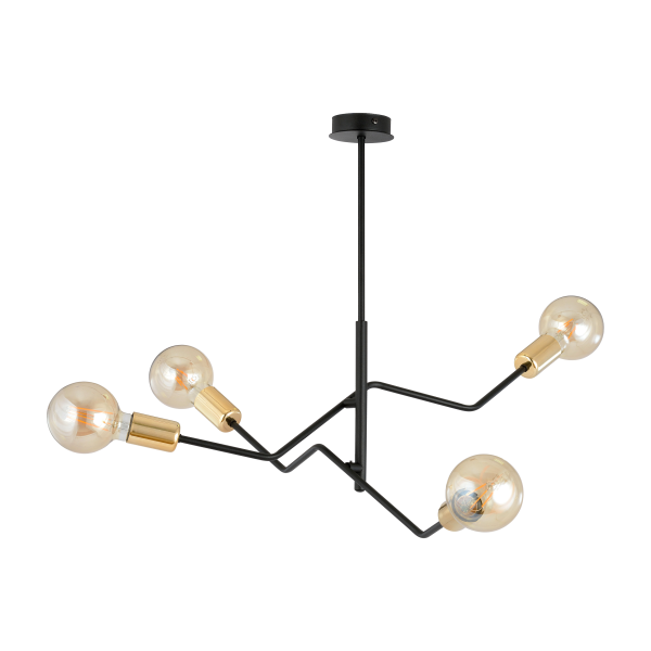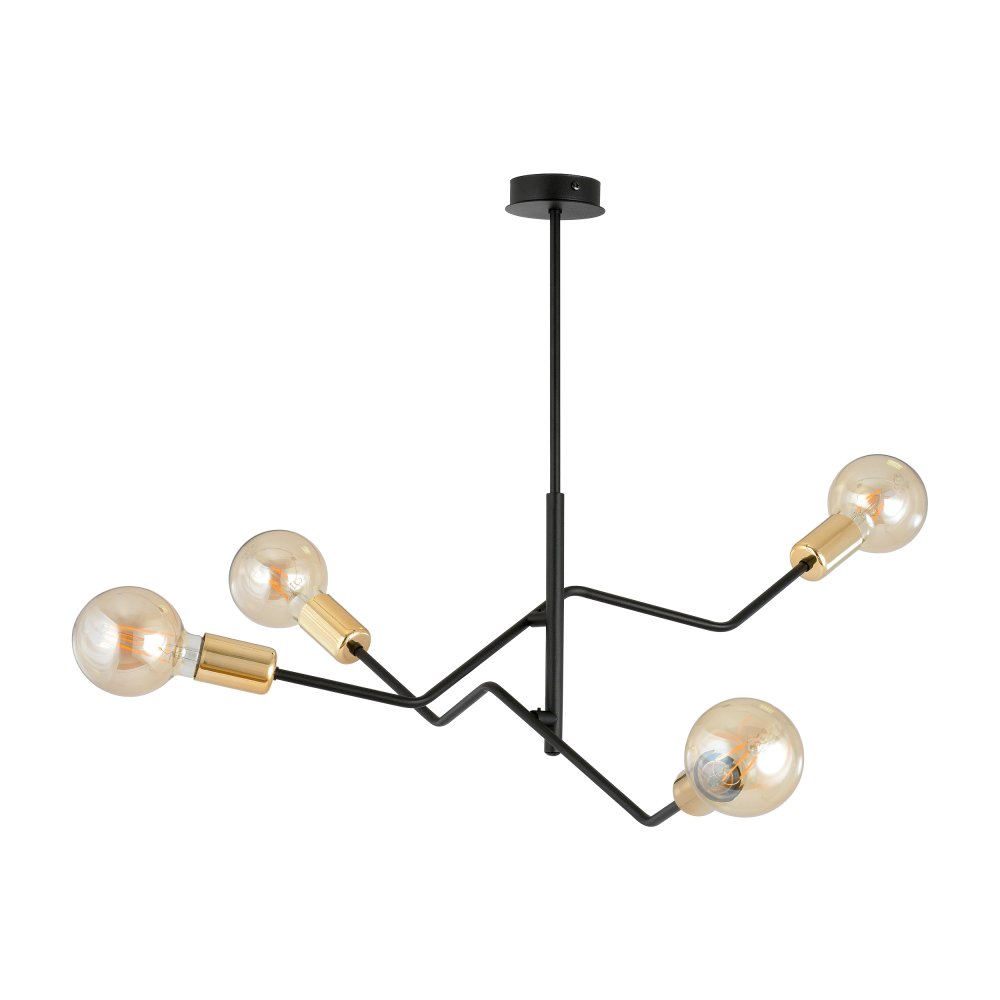 GIRO to lampa wisząca przystosowana na 4 żarówki z gwintem E27, o maksymalnej mocy 60W każda (brak w zestawie). Zastosowanie wymiennego źródła światła pozwala każdemu użytkownikowi na indywidualny dobór rodzaju żarówki i na dostosowanie jej kształtu oraz barwy światła do własnych preferencji. Lampa ma prostą, minimalistyczną, wręcz surową formę, która odpowiednia będzie do nowoczesnych, nawet industrialnych wnętrz. Świetnie prezentuje się z żarówkami typu filament. Korpus lampy wykonany jest ze stali malowanej proszkowo na kolor czarny, natomiast oprawki żarówek są w kolorze złotym. Produkt nadaje się do montażu natynkowego w pomieszczeniach suchych. Wyprodukowano w Polsce.