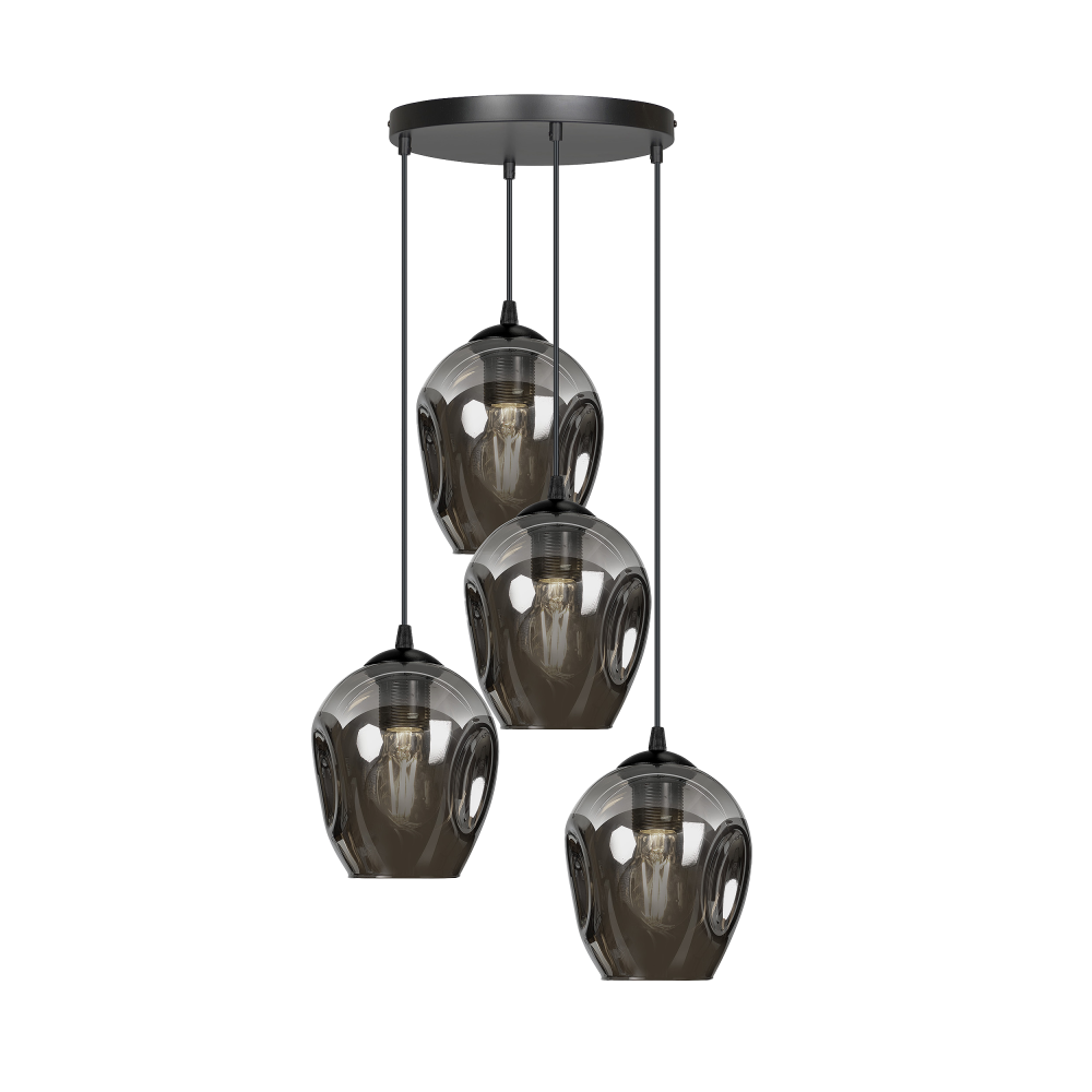 IRIS to lampa wisząca przystosowana na 4 żarówki z gwintem E27, o maksymalnej mocy 60W (brak w zestawie). Zastosowanie wymiennego źródła światła pozwala każdemu użytkownikowi na indywidualny dobór rodzaju żarówki i na dostosowanie jej barwy światła do własnych preferencji. Lampa ma bardzo charakterystyczną formę. Składa się z czterech owalnych kloszy, wykonanych ze szkła o grafitowej barwie, które mają po bokach dekoracyjne wgłębienia. Klosze lampy dekoracyjnie rozpraszają światło w dół, dlatego warto zastosować żarówki typu filament, które dodają jej industrialnego sznytu. Takie rozwiązanie pozwoli uzyskać efekt, który będzie mocnym akcentem dekoratorskim i z pewnością będzie przykuwać uwagę. W naszej ofercie dostępne są różne warianty kolorystyczne szklanych kloszy: grafitowe, transparentne, złote oraz mix kolorów. Produkt przystosowany do montażu natynkowego w pomieszczeniach suchych. Wyprodukowano w Polsce.