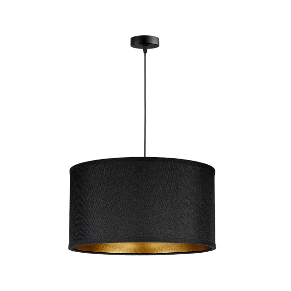 Cylindryczna lampa w kolorach czerni i złota jest eleganckim i nowoczesnym dodatkiem do każdego pomieszczenia. Jej prosta forma składa się z matowej, czarnej ramy, którą uzupełniają złote akcenty kloszy. Złote wykończenie klosza odbija światło i dodaje lampie luksusowego wyglądu i przyciągają uwagę.