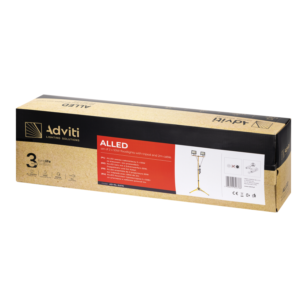 Zestaw 2 naświetlaczy ze statywem i przewodem. Naświetlacze przeznaczone są do stosowania w gospodarstwach domowych oraz do użytku wewnątrz (garaże, hale), jak i na zewnątrz pomieszczeń, jako oświetlenie parkingowe, ogrodowe, posesji, fasad, reklam, itp. Źródłem światła są diody LED SMD. Wysoki stopień szczelności IP65 zapewnia odporność na zakurzenie, zapylenie i kontakt z wodą. Teleskopowy statyw posiada płynną regulację wysokości do 150cm. Pozwala skierować światło w dowolnym kierunku. Zestaw jest bardzo prosty w montażu.