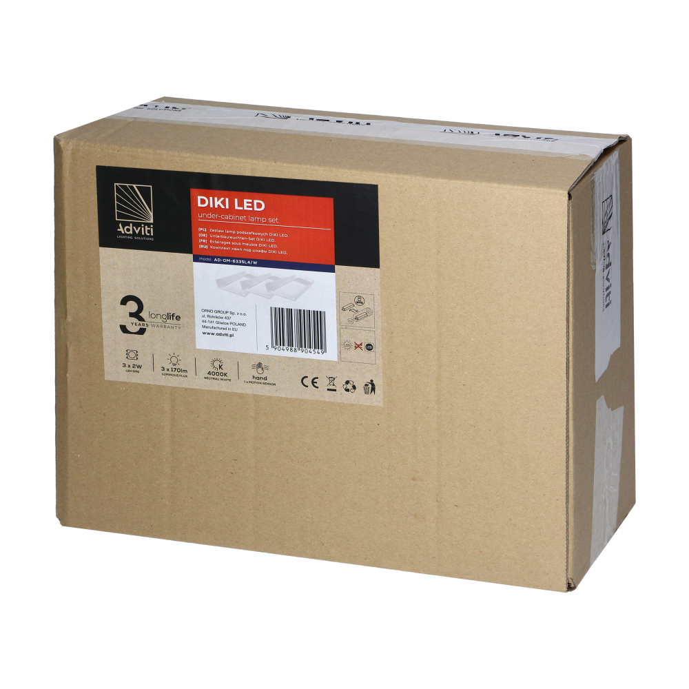 Zestaw DIKI składa się z 3 lamp podszafkowych LED o mocy 2W każda. Jedna z lampek posiada włącznik bezdotykowy, który aktywuje światło we wszystkich trzech oprawach po wykryciu ruchu ręki w pobliżu włącznika. Jest to bardzo przydatne szczególnie w kuchni, gdzie bardzo często potrzebujemy włączyć oświetlenie, gdy nasze ręce są brudne lub mokre. Do każdego zestawu dołączony jest zasilacz sieciowy o mocy 15W i długości 2 m. Każda lampa DIKI montowana jest za pomocą 4 śrub dołączonych do zestawu. Ten rodzaj oświetlenia przeznaczony jest do montażu np. do dolnej płaszczyzny półki lub szafki, dlatego proponowany jest przede wszystkim do stosowania w kuchni. Zestaw można rozbudować o dodatkowe punkty świetlne z serii, jeśli zachodzi potrzeba powiększenia zestawu. Oprawy emitują światło o przyjemnej i neutralnej barwie 4000K. Kolor biały.