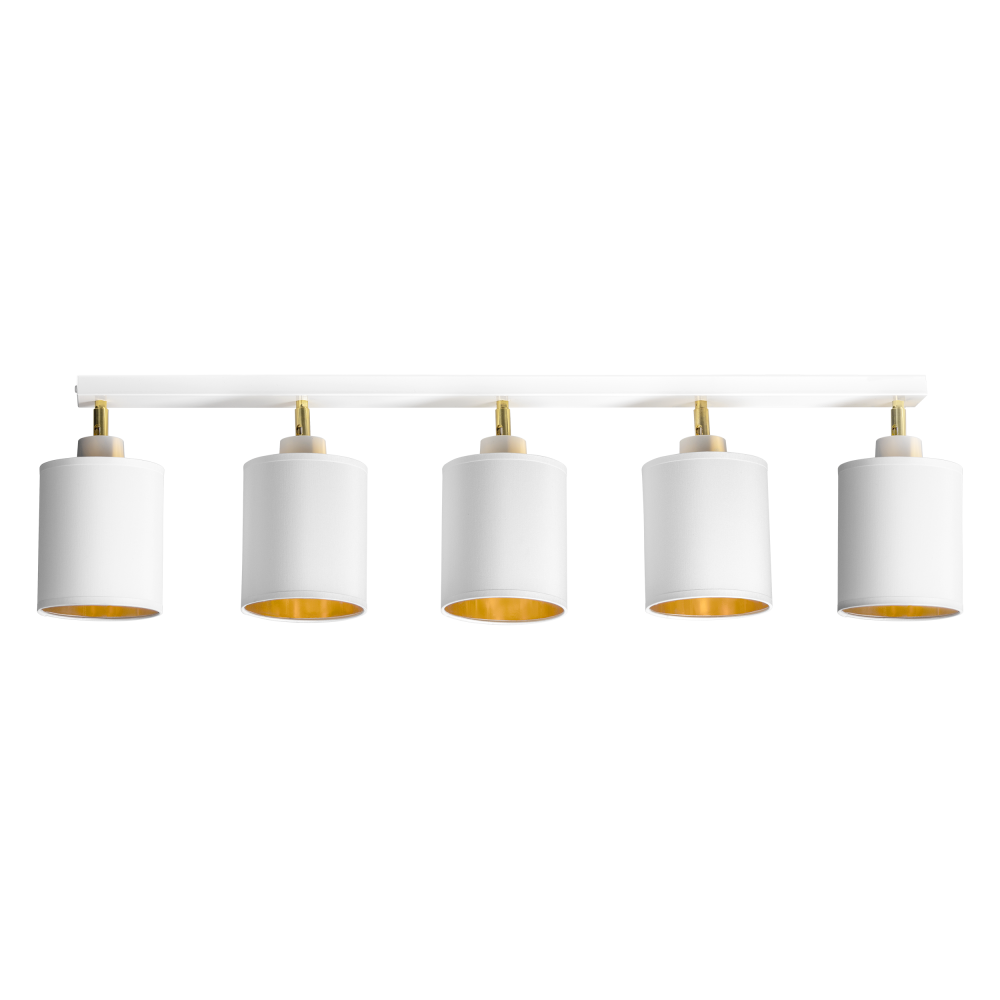 BATI to oprawa ścienno-sufitowa przystosowana na 5 żarówek z gwintem E27 o maksymalnej mocy świecenia 60W każda (brak w zestawie). Zastosowanie wymiennego źródła światła pozwala każdemu użytkownikowi na indywidualny dobór rodzaju żarówki i na dostosowanie jej kształtu oraz barwy światła do własnych preferencji. Lampa utrzymana jest w stylu nowoczesnym i doskonale wkomponuje się w pomieszczenia utrzymane w stylu minimalistycznym, nawet industrialnym. BATI to interesująca lampa. Klosze mają klasyczną, cylindryczną formę i biały kolor, jednak ich wnętrze zaskakuje barwą miedzi, która przepięknie odbija światło i tworzy ciekawy efekt świetlny. Wszystkie klosze połączone są wspólną listwą, ale każdy z nich jest ruchomy, więc poszczególne snopy światła można skierować w dowolną stronę. Korpus oprawy wykonany jest z metalu malowanego proszkowo, z kolei klosze są połączeniem tworzywa sztucznego i tkaniny syntetycznej. Długość całkowita lampy wynosi 105 cm.