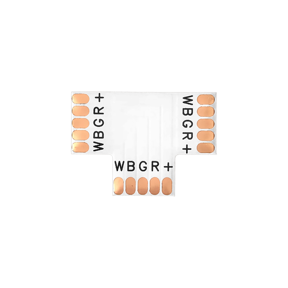 Złączka “T” do taśm LED o szerokości 12 mm i mocy max. 48V. To rozwiązanie daje możliwość łączenia trzech odcinków taśm LED RGBW (światło białe i kolorowe). Dzięki drobnemu rozmiarowi sprawdza się przy łączeniu taśm w profilach aluminiowych – z koniecznością lutowania.